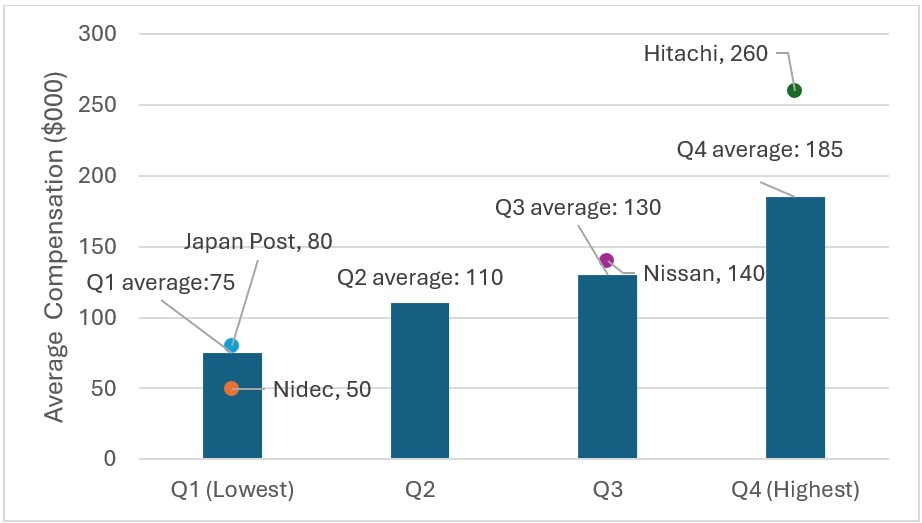 11. Total compensation from the Yuho (March disclosure of Yen 60mn) divided by the number of directors (7). This is converted into USD using FX on 23rd December and the output is displayed rounded to the nearest $10,000. The same FX is used for all Topix 100 names and the quartile averages.