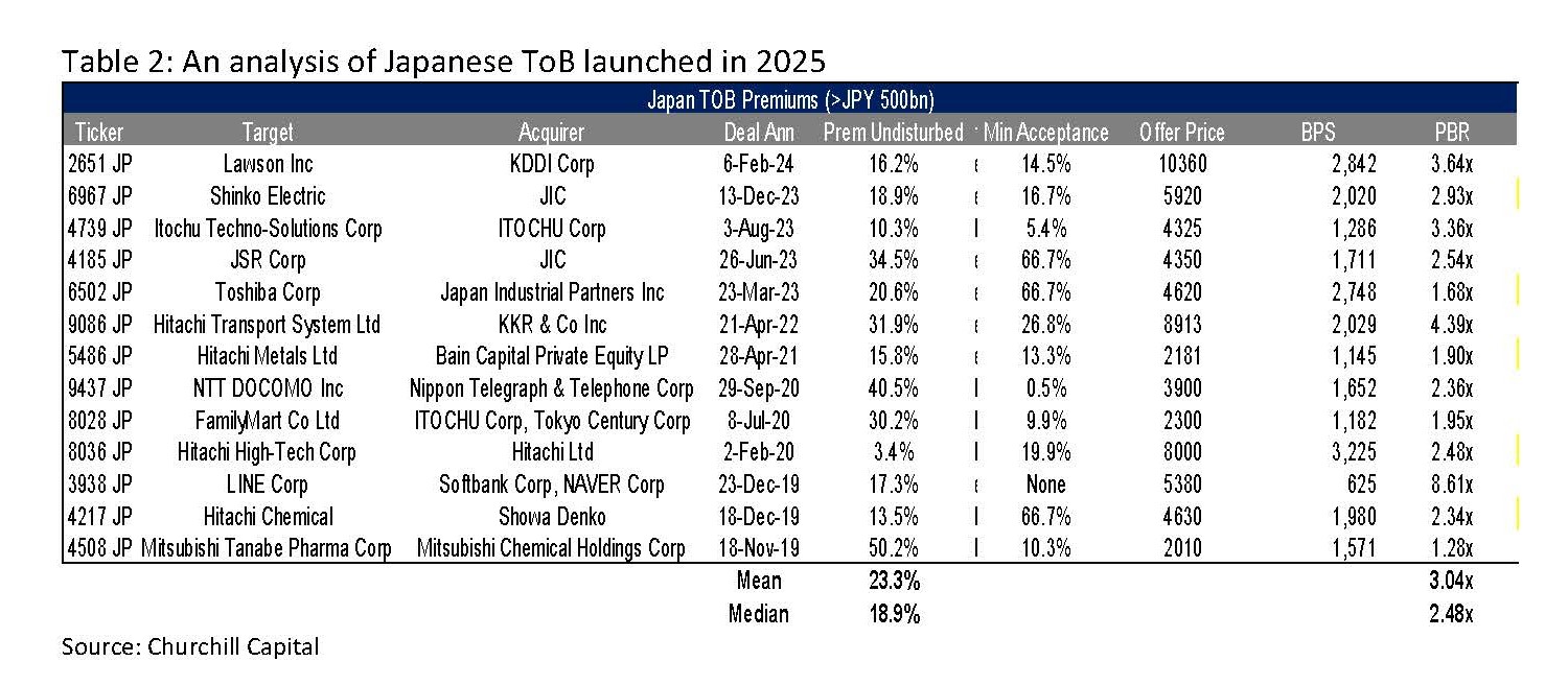 Table 2 below sets out the average premium and offer price to book value for 13 large-cap ToB transactions since the introduction of METI’s Fair M&A Guidelines in 2019. The mean premium of 23.3% (median premium at 18.9%) to the undisturbed share price is lower than TICO’s at 42.2%. Note that narrowing the timeline of this analysis, TSE has released a distribution of takeover premia after revisions of the code (July 2025) which shows the average premium for MBOs launched since July is higher at 52%[13] . However, the variance of the offer price over book value is striking: the mean for the offer price for comparable transactions has been at 3.04x BVPS (median of 2.48x) with practically all the comparable transactions at a significant premium, while TICO is being taken private at a discount to book value.