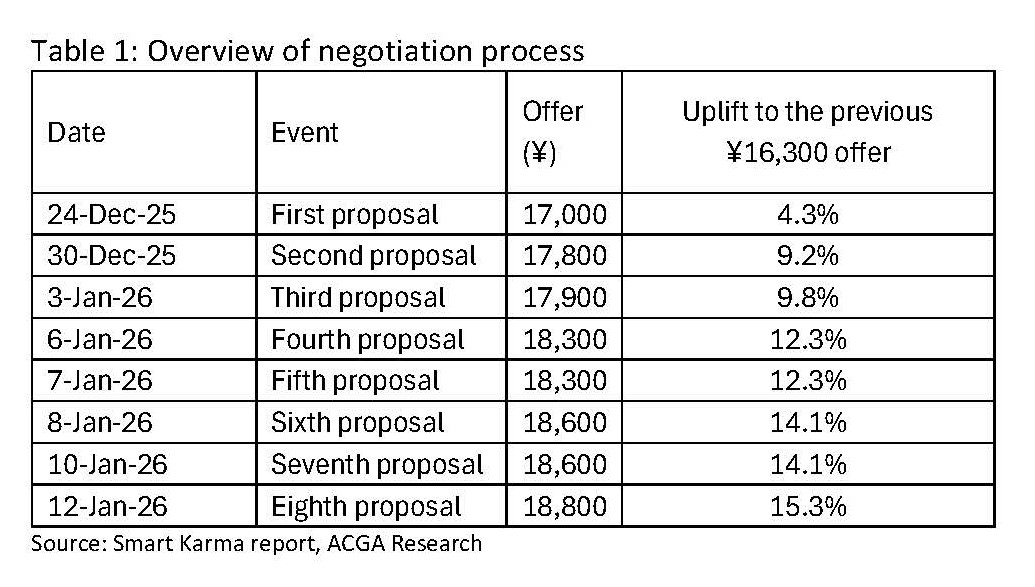 Shareholders have noted that the updated ToB price is still below the independent FA midpoint of sum of the parts (SOTP) valuation[11]. TICO’s most recent book value per share (BVPS) was ¥20,286, based on third quarter earnings data released on 3 February 2026, against which the updated ToB price is at a 7.9% discount[12].