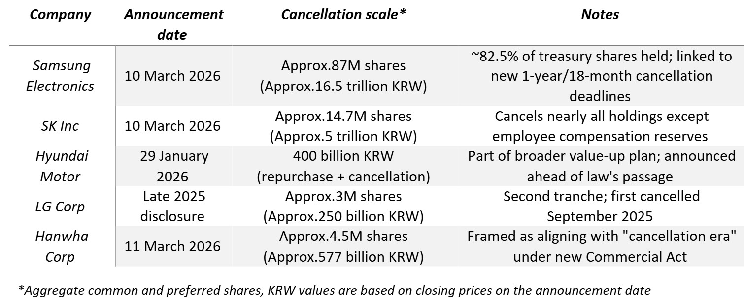 On the ground, a more pragmatic corporate response has also emerged. Even before the law's full implementation, a number of key companies such as the holding company or crown jewels of the conglomerates have moved proactively, announcing large-scale cancellations framed as shareholder-value initiatives, and in some cases explicitly linking them to the new regulatory timeline. The scale of these announcements, detailed in the table below, is notable.